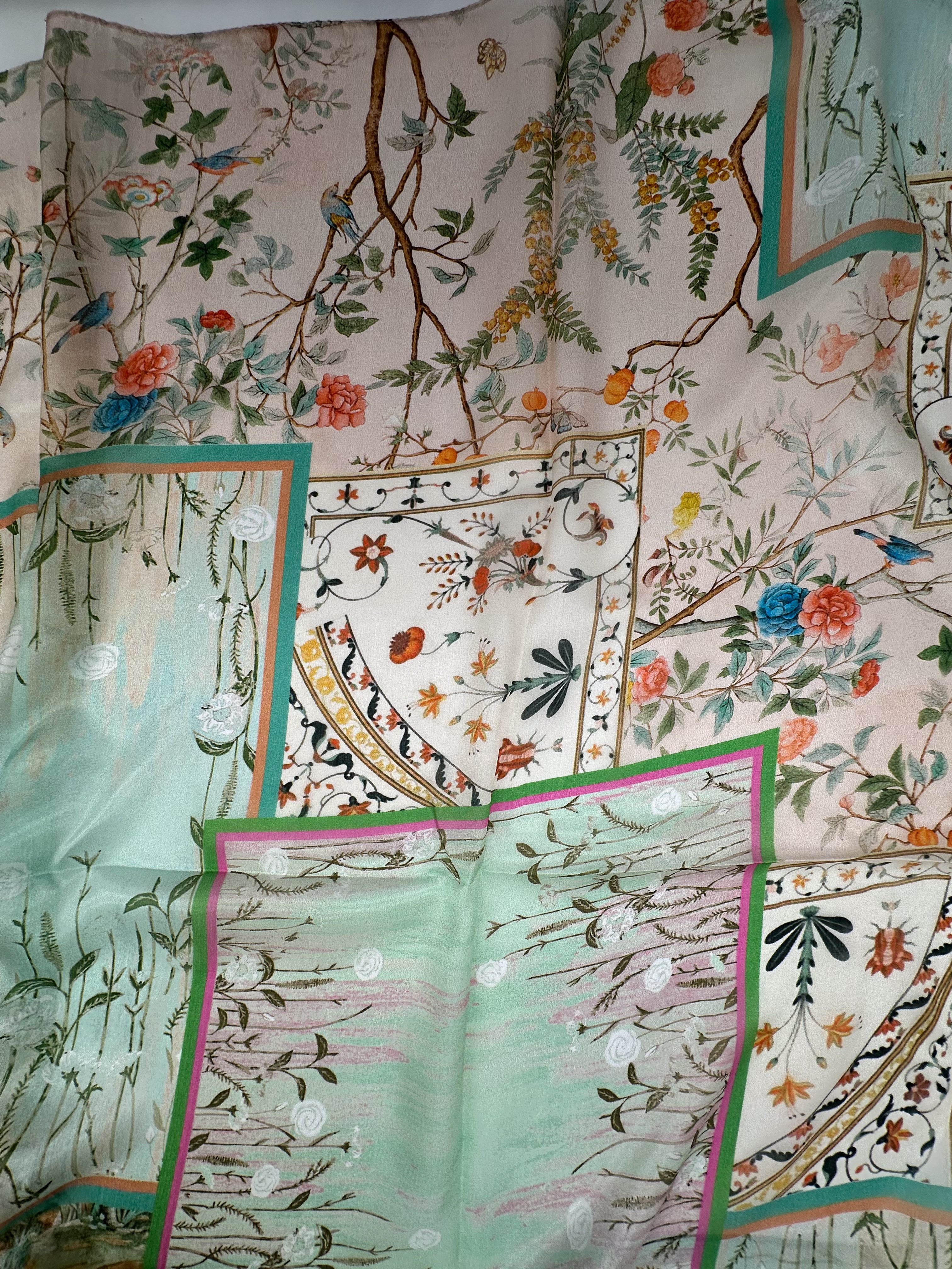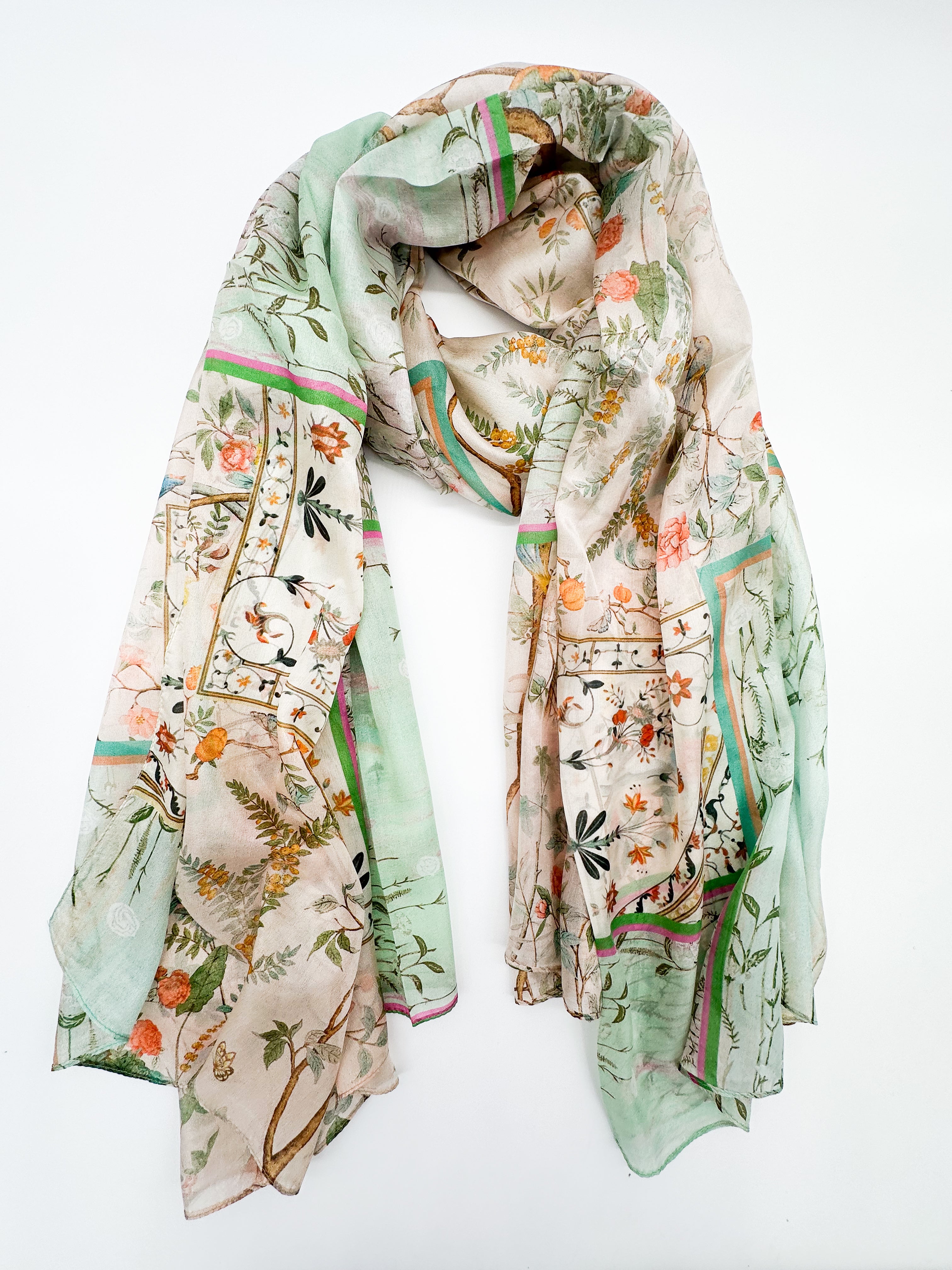 A natural silk chiffon scarf is perfect for wearing with a dress, top, as well as a spring coat or other light outerwear! This scarf is airy, transparent, and light with a beautiful fabric drape.