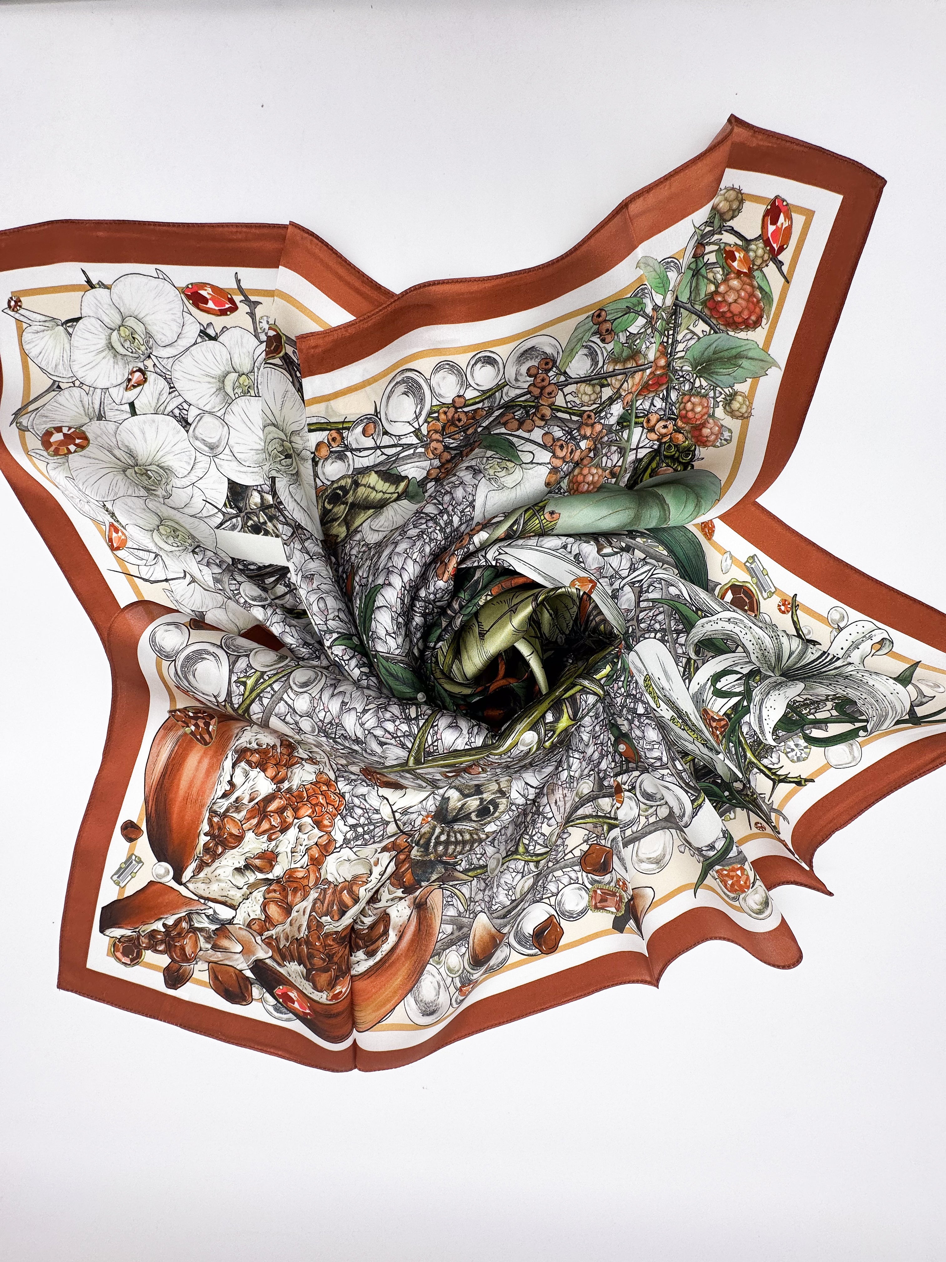 Natural silk satin scarf 90x90 cm "Ivy and butterfly"