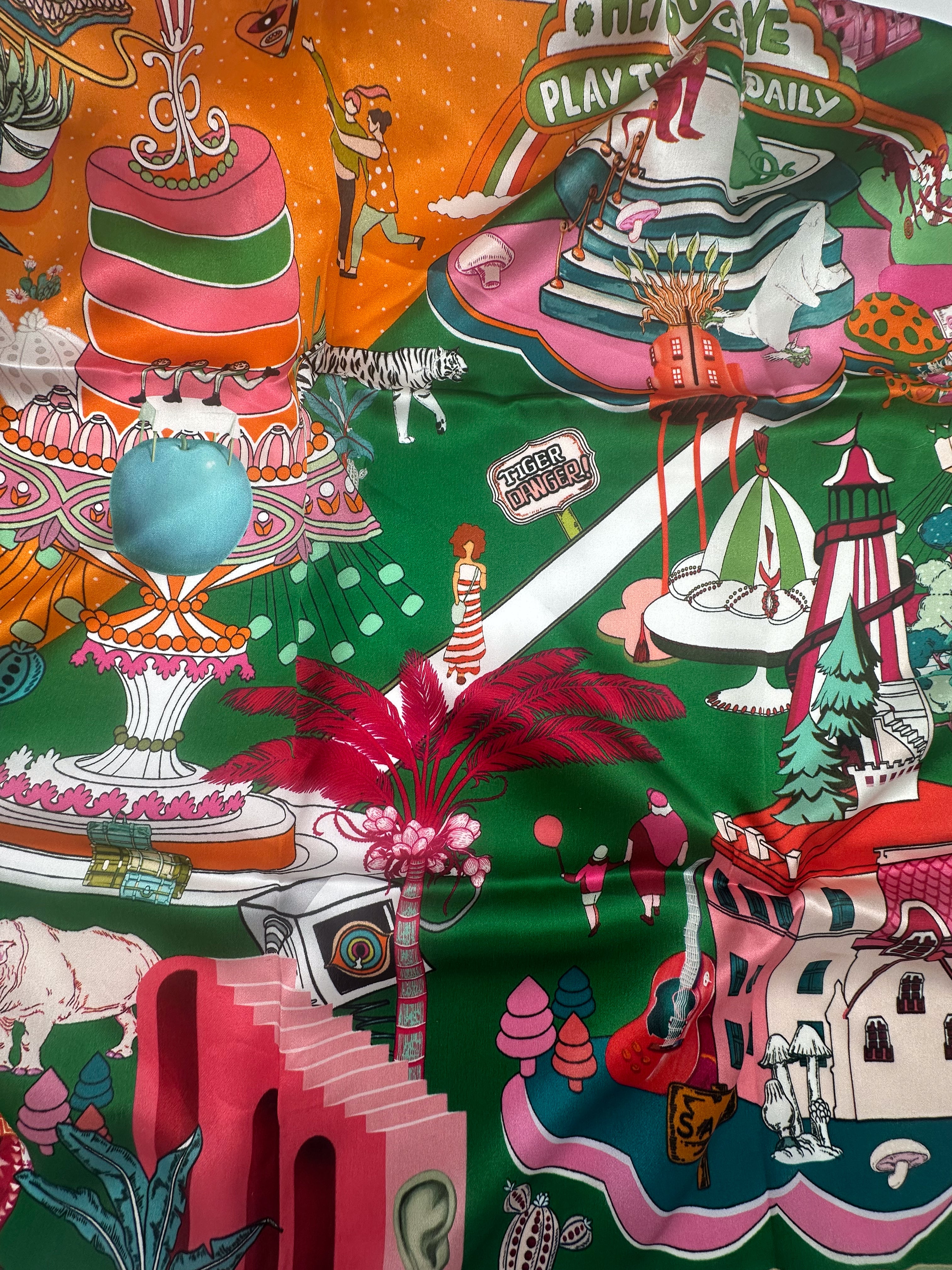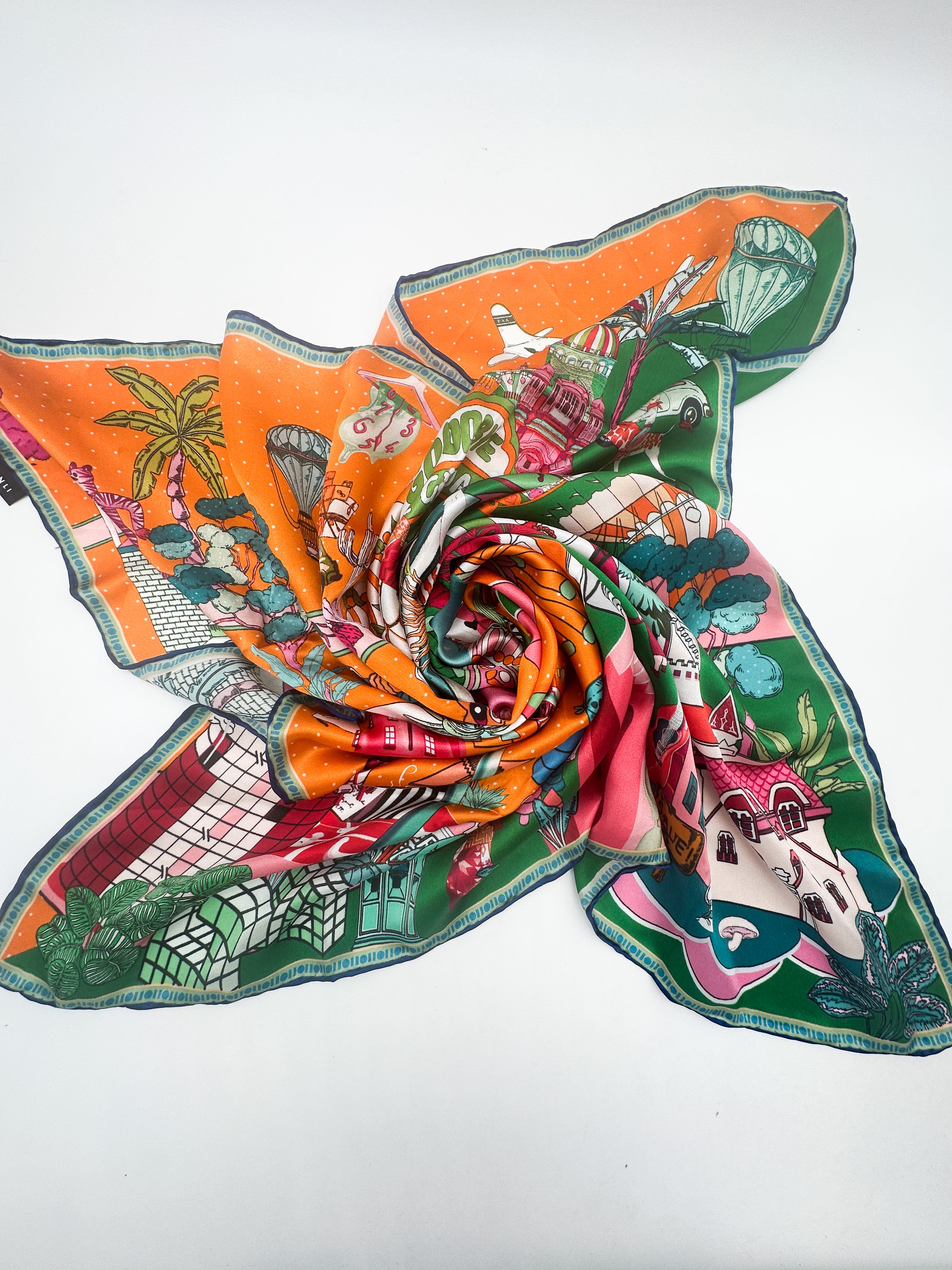 The silk scarf is perfect for wearing around the neck, as a turban, or as an accessory on a bag.