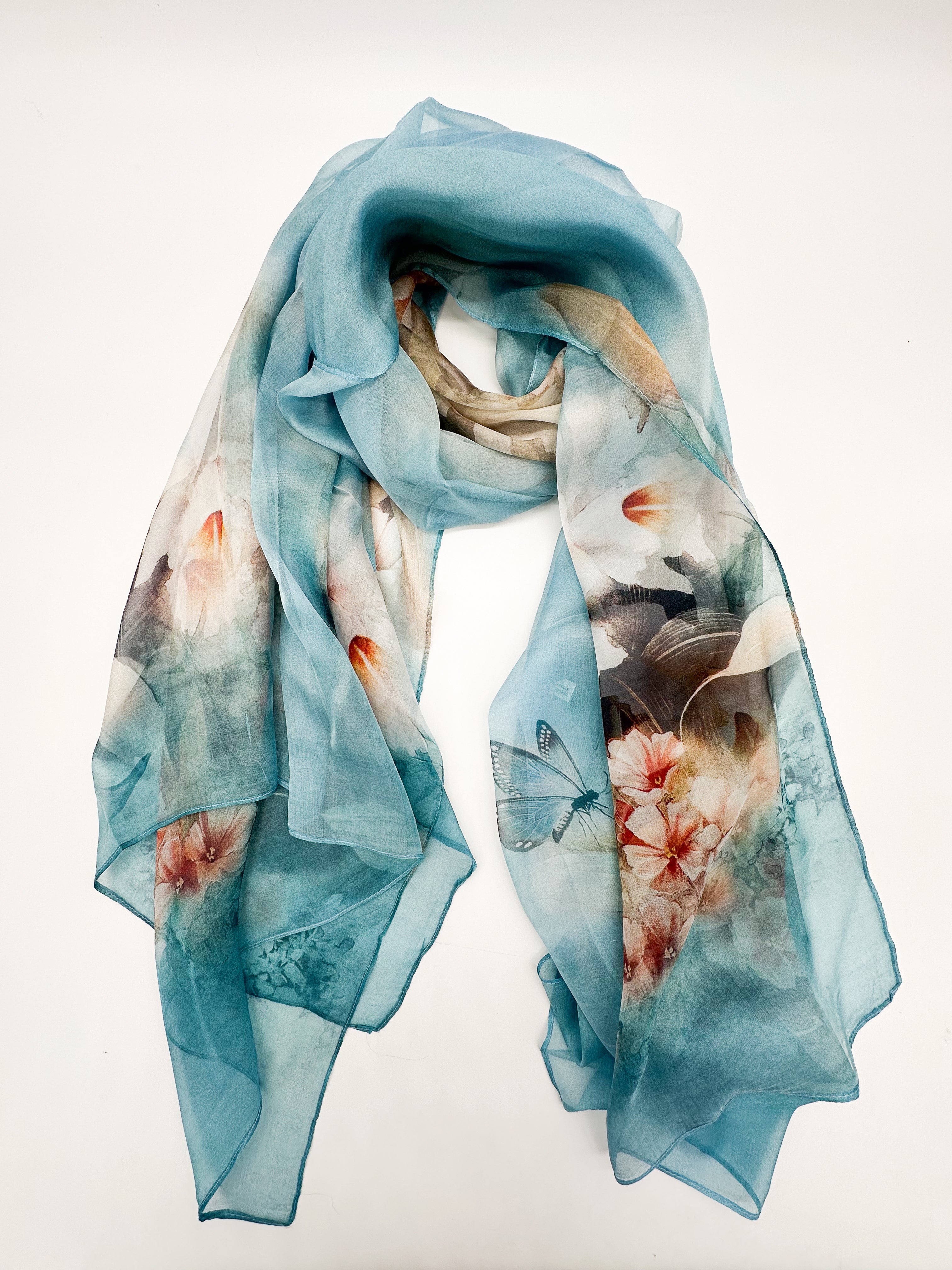 The natural silk chiffon scarf is perfect for wearing with a dress, top, as well as a spring coat or other light outerwear! This scarf is airy, sheer and lightweight with a beautiful drape.